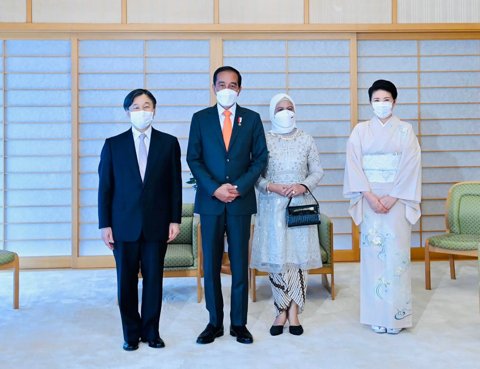 Saat tiba di teras depan kediaman Kaisar, Presiden Jokowi dan Ibu Iriana langsung disambut oleh Kaisar Naruhito dan Permaisuri Masako sesaat setelah turun dari kendaraannya.